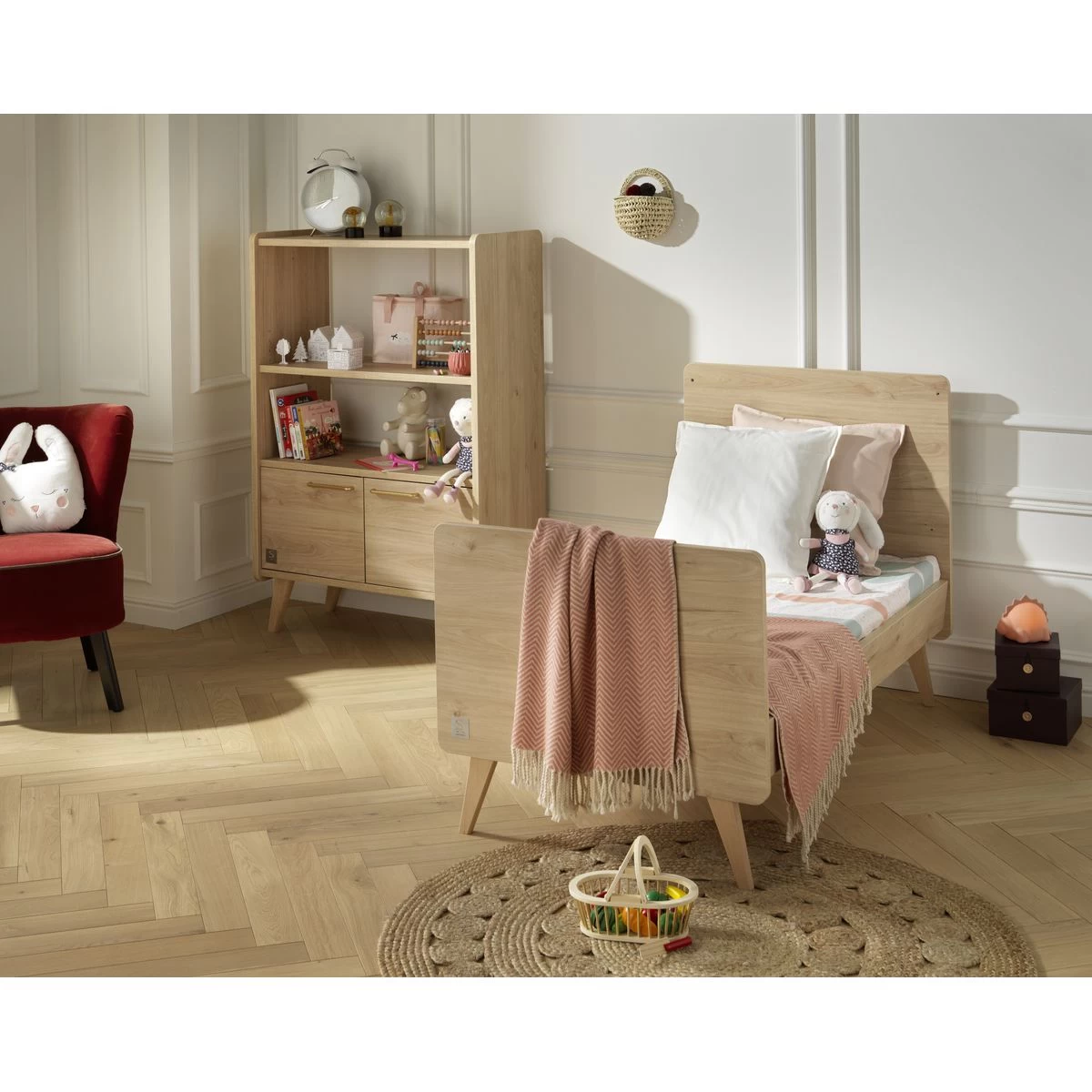 Des lignes rétro en panneaux décor Chêne Suave avec des finitions arrondies pour une chambre cocooning inspirée des tendances vintage.