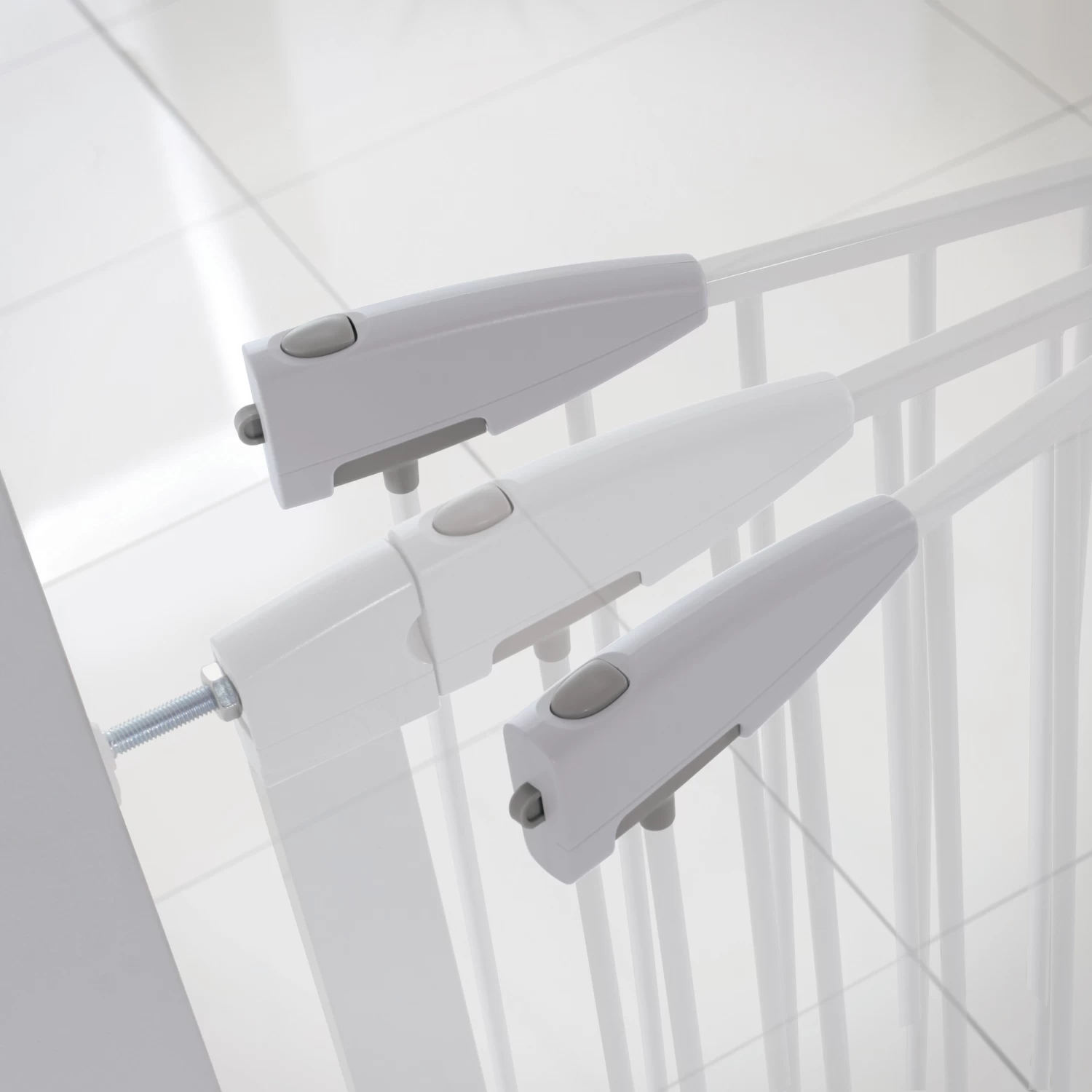 - Barrière avec rallonges : Barrière adaptée à des ouvertures de 73 à 79 cm, peut être étendue jusqu’à 114 cm grâce aux rallonges (vendues séparément). S’installe en 5 minutes grâce aux outils fournis