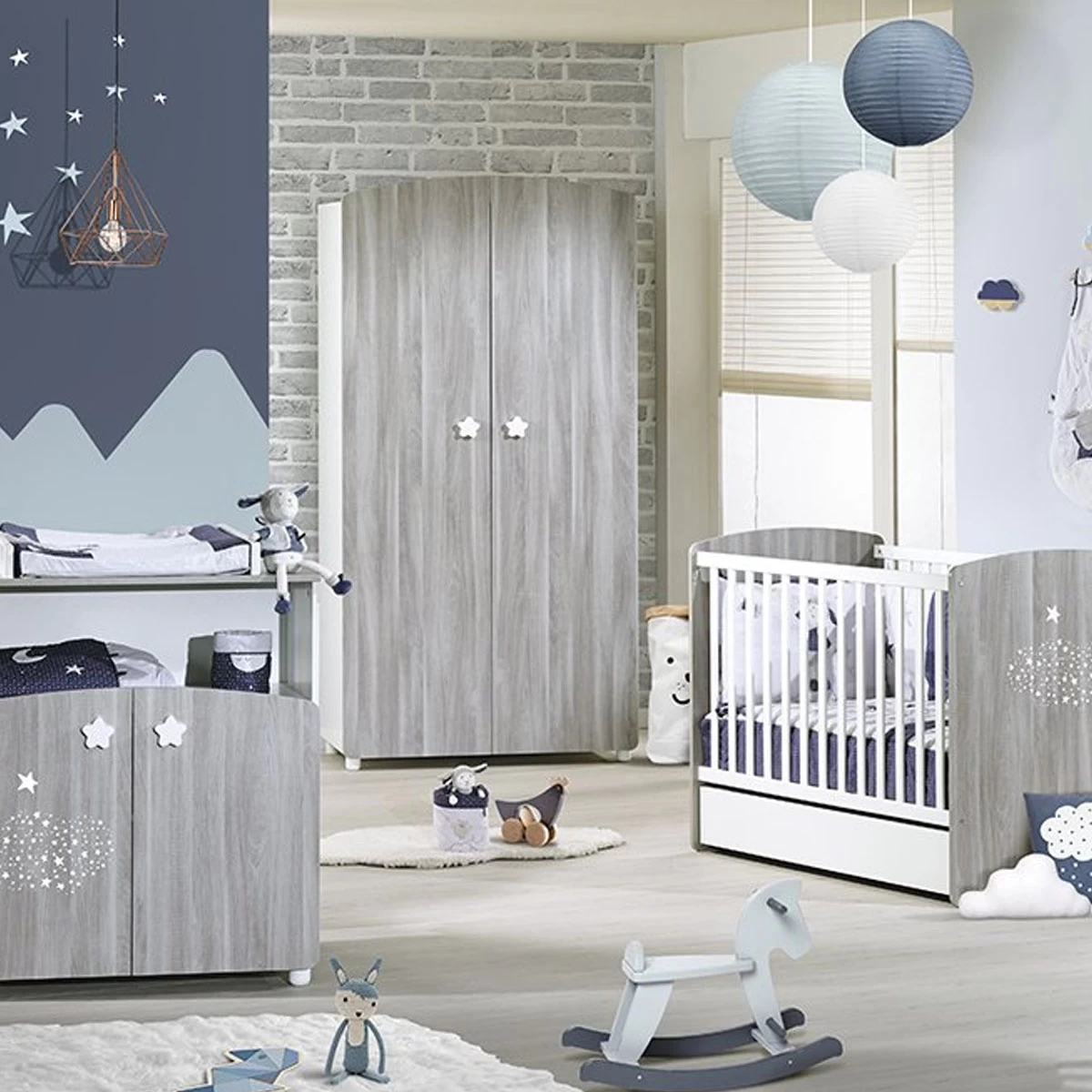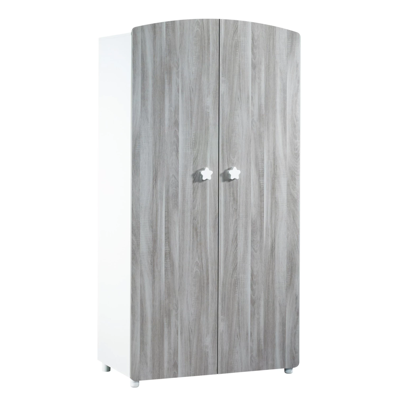 Armoire 2 portes de la chambre Hugo de Sauthon. Armoire avec 1 séparation verticale, 6 tablettes dont 2 avec tringles. Idéale pour stocker tous les vêtements et toutes les affaires de bébé. A agrémenter avec la commode et le lit de la collection Hugo pour coordonner la chambre de votre tout-petit.
