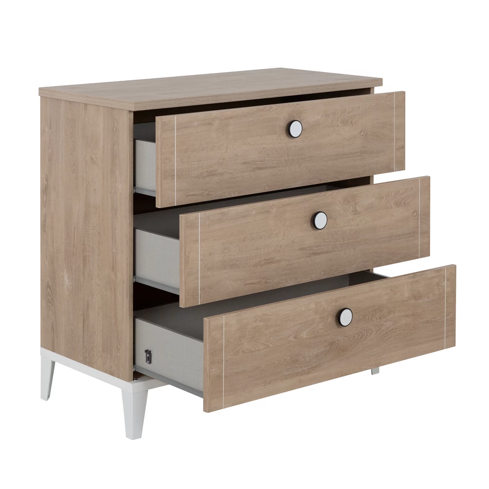 Cette commode enfant dispose de trois tiroirs d’une profondeur de 46 cm offrant un vaste espace de rangement pour les affaires de bébé. Ils sont habillés avec du polypropylène imitant le textile et sont fixés sur des coulisses à galets grises. Pour éviter de troubler le sommeil de bébé, les tiroirs disposent de freins amortisseurs pour une fermeture tout en douceur.