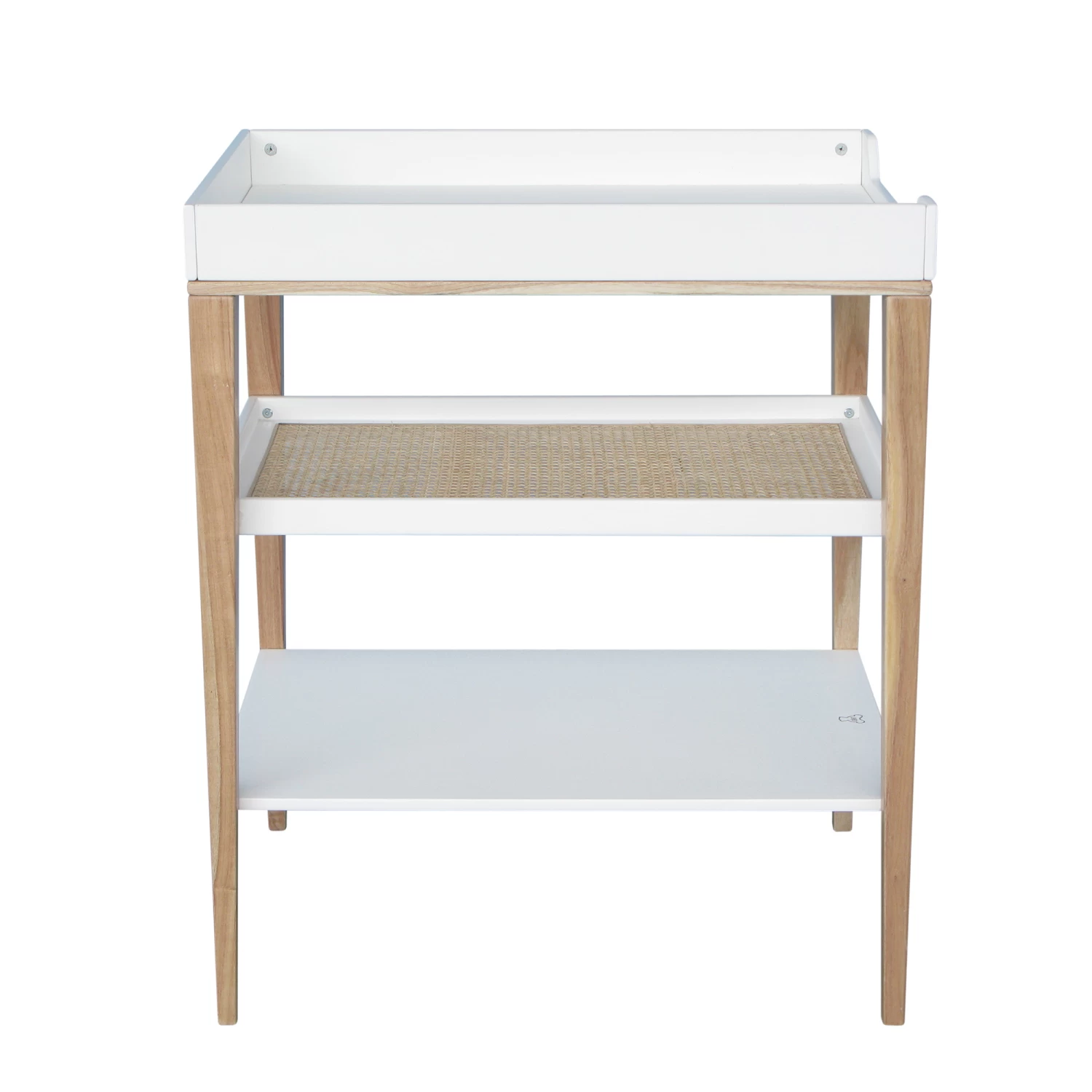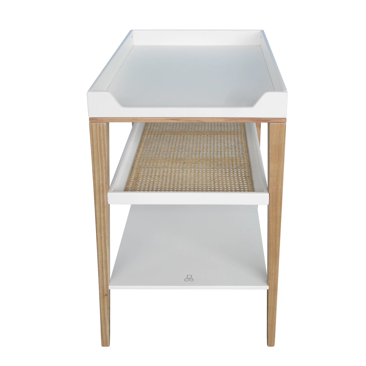 Assortie au reste de la chambre Nami, cette ravissante table à langer possède deux étagères sous le plateau. Les montants sont en bois massif, et les planches et le plan à langer en MDF, avec un insert de cannage de rotin naturel sur la planche du haut. Son plan à langer accueille un matelas de 52 x 75 cm (non fourni).
