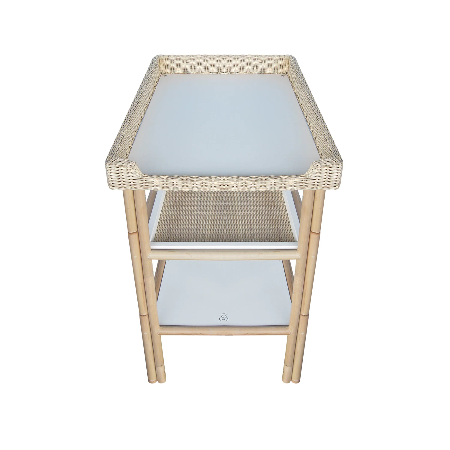 Assortie au reste de la chambre Océania, cette ravissante table à langer possède deux étagères sous le plateau. Avec ses deux roues, elle peut facilmeent suivre bébé dans les différentes pièces de la maison. Les montants sont en canne de rotin naturelle, les planches en MDF et le contour du plan à langer en rotin tressé naturel. Son plan à langer accueille un matelas de 52 x 75 cm (non fourni).